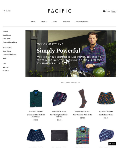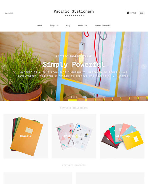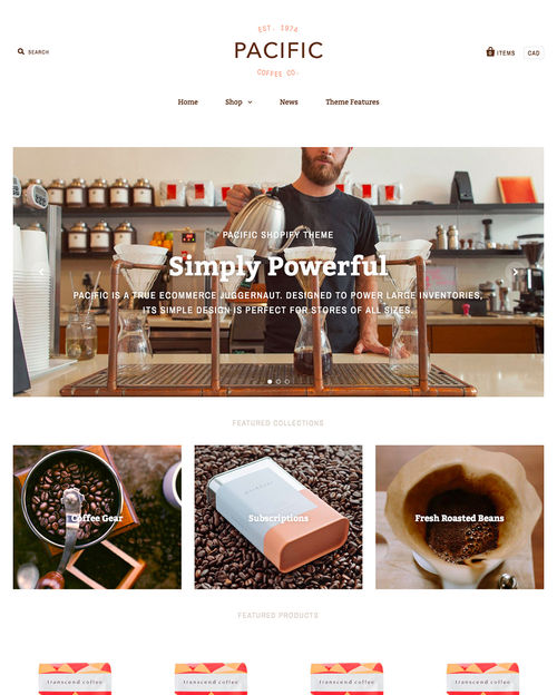 This is a Shopify theme called Pacific. It features search engine optimization, video background support, bold imagery, multiple design styles, and more.