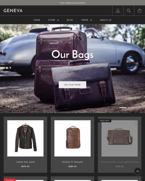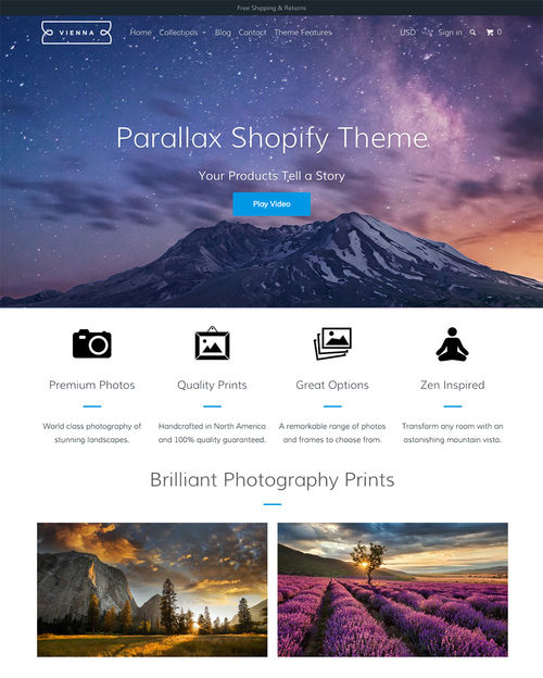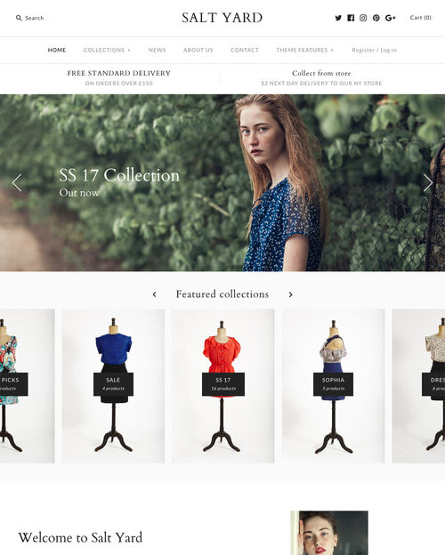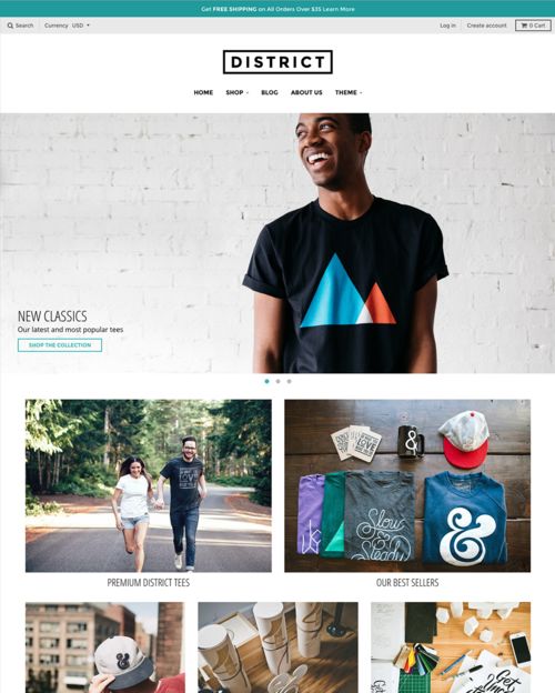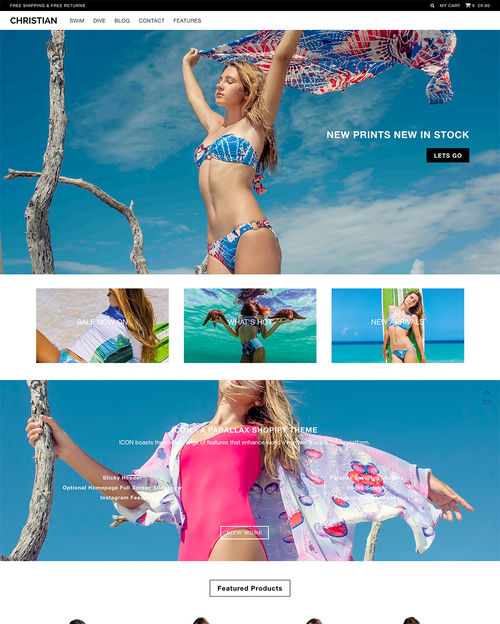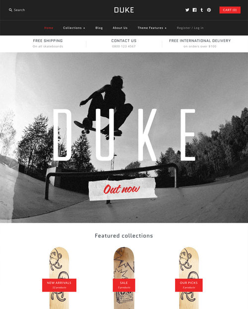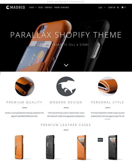 This Shopify theme is available from Shopify, and it features multiple design styles, search engine optimized code, parallax elements, fixed (sticky) menus, featured products, Instagram support, and more.