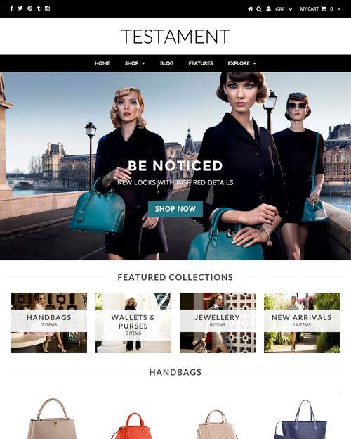 Testament, available from Shopify, is a Shopify theme which features multiple design styles, sidebars video integration, search engine optimized code, and more.