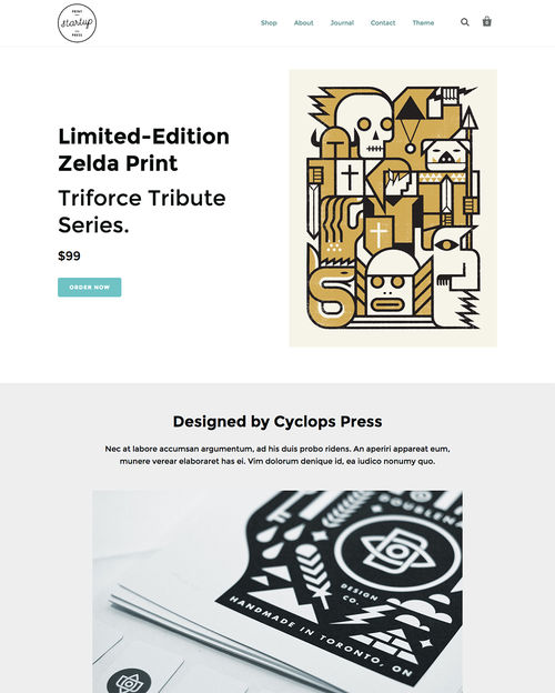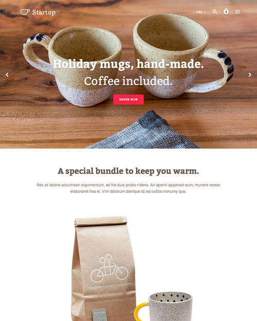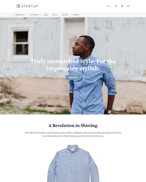 Startup, available from Shopify, is a fresh new ecommerce theme which features differing styles, search engine optimization, customer testimonial support, video embedding functionality, and more.