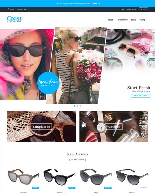 This fresh new ecommerce theme is available from Shopify, and it features search engine optimization, multiple child themes, features a grid layout, and more.