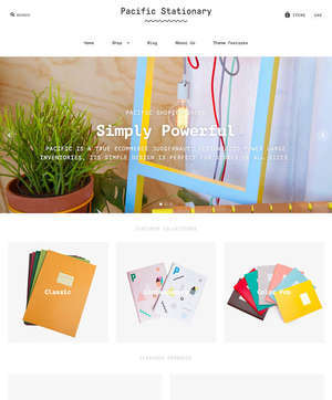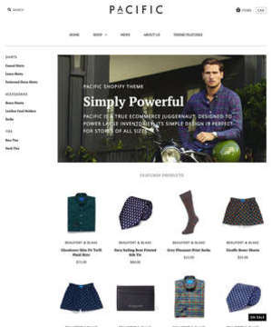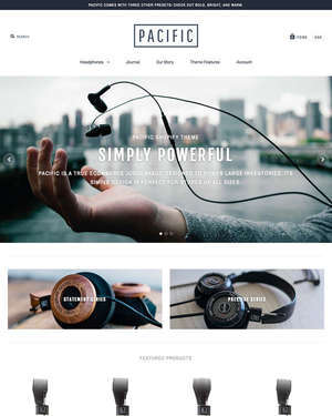 This is a Shopify ecommerce theme called Pacific. It features video embedding functionality, multiple styles, search engine optimization, and bold design elements.