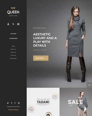 Here’s a Shopify ecommerce theme which features parallax backgrounds, search engine optimized code, support for multiple currencies, a user registration form, favicon support, newsletter integration, a responsive layout, Bootstrap framework utilization, a set of dropdown menus, contact form integration, social media support, online chat functionality, grid layouts, jQuery effects, and more.